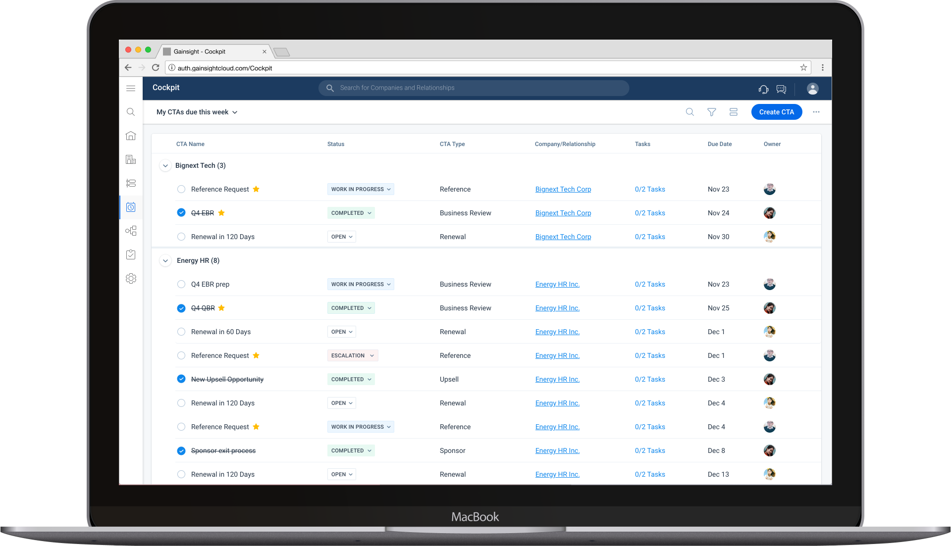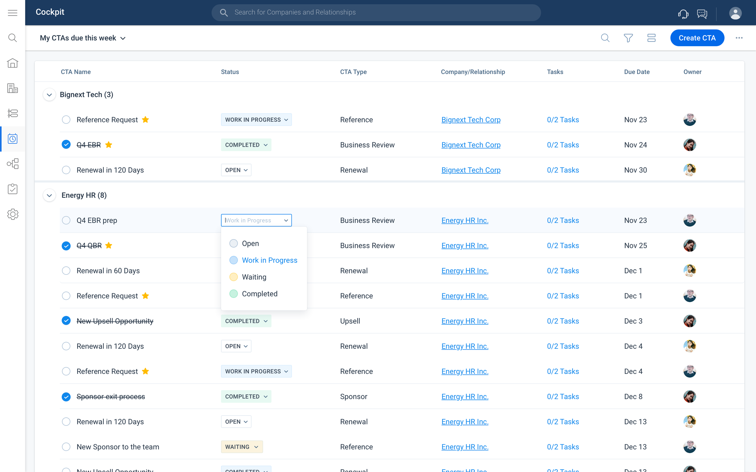 Cockpit is a Task management tool that is the Customer Success/ Account Management team's home base for viewing and managing key Customer activities like Renewal Prep, Possible churn based on low usage, Upsell Opportunities, Low Survey Scores, etc.